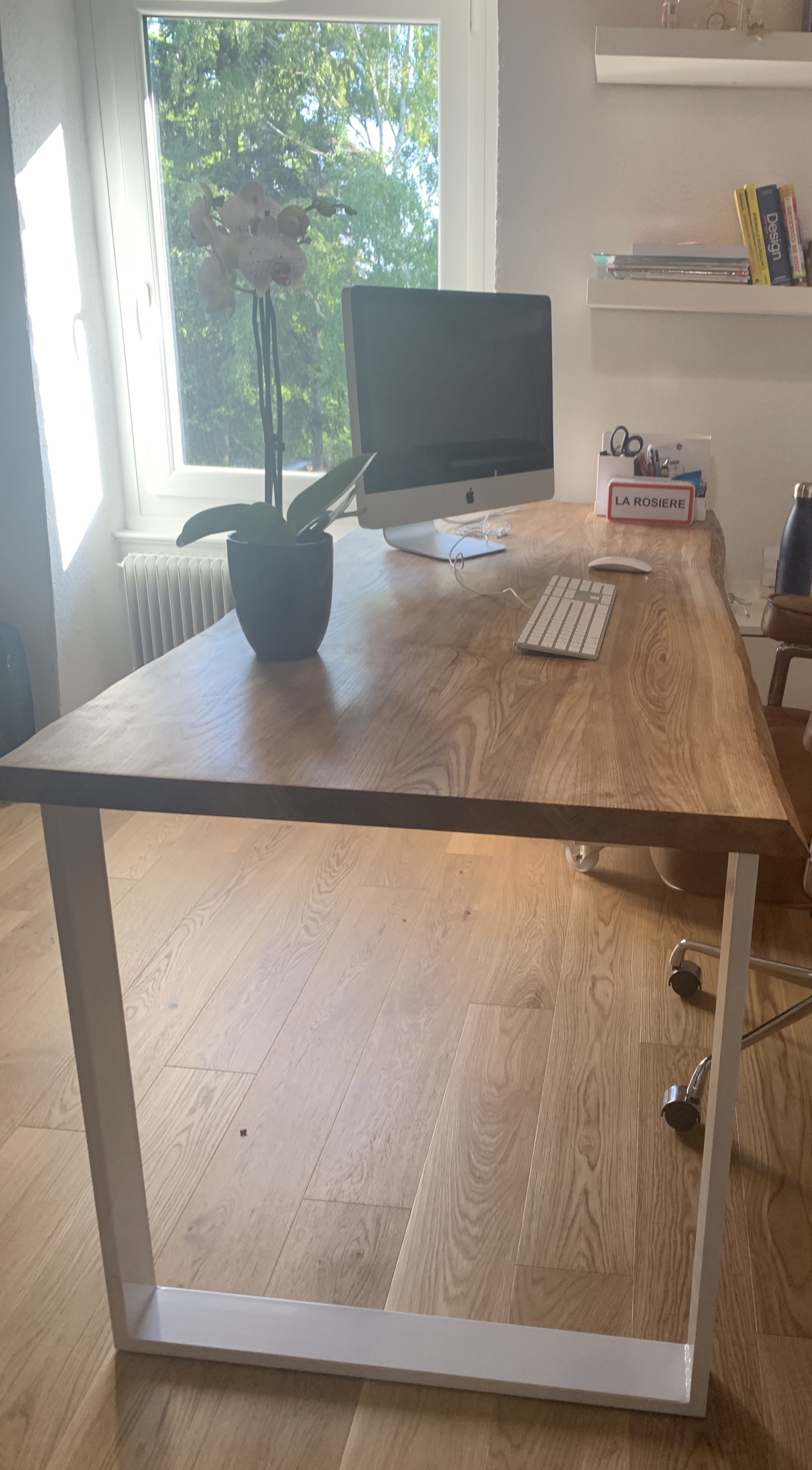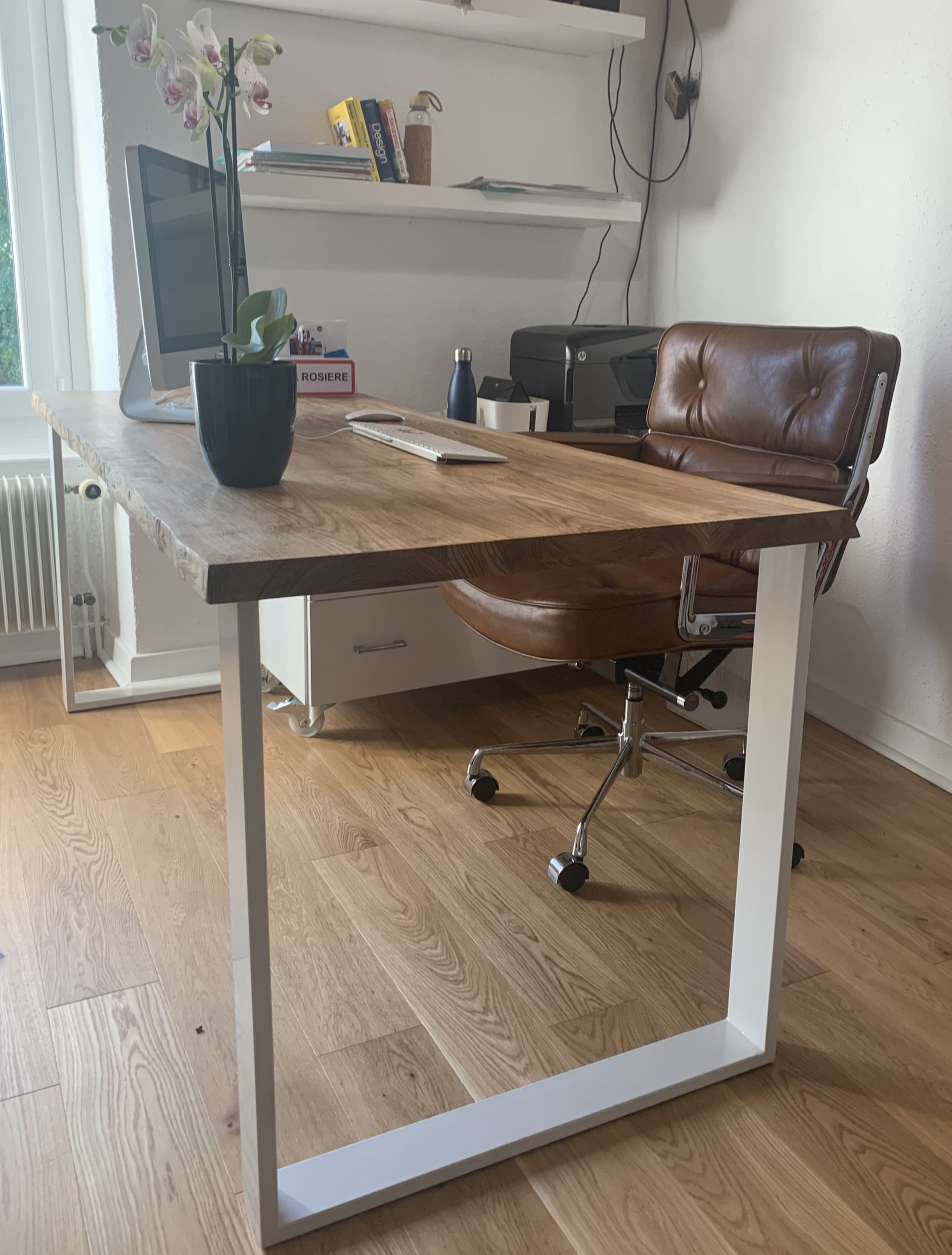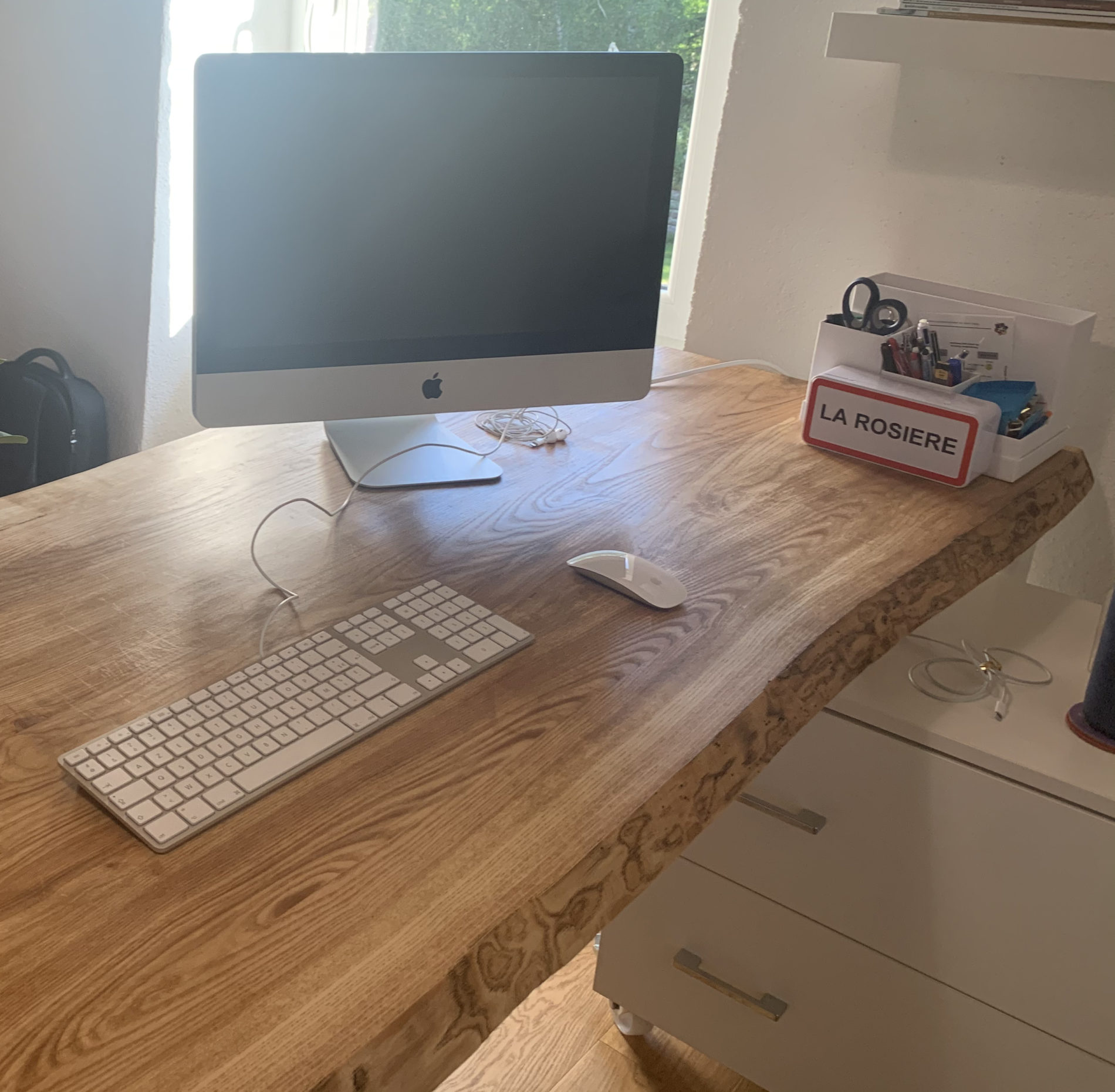 Voici la réalisation de l’une de nos clientes pour son bureau : Un plateau live Edge en Lames Massives Frêne.
