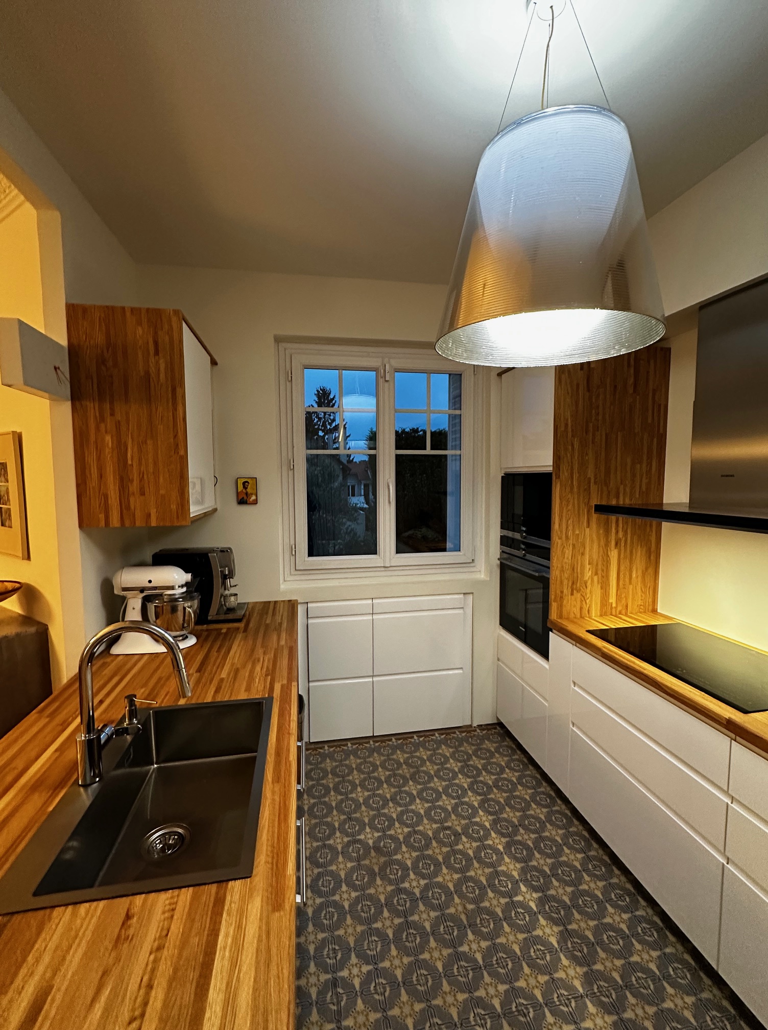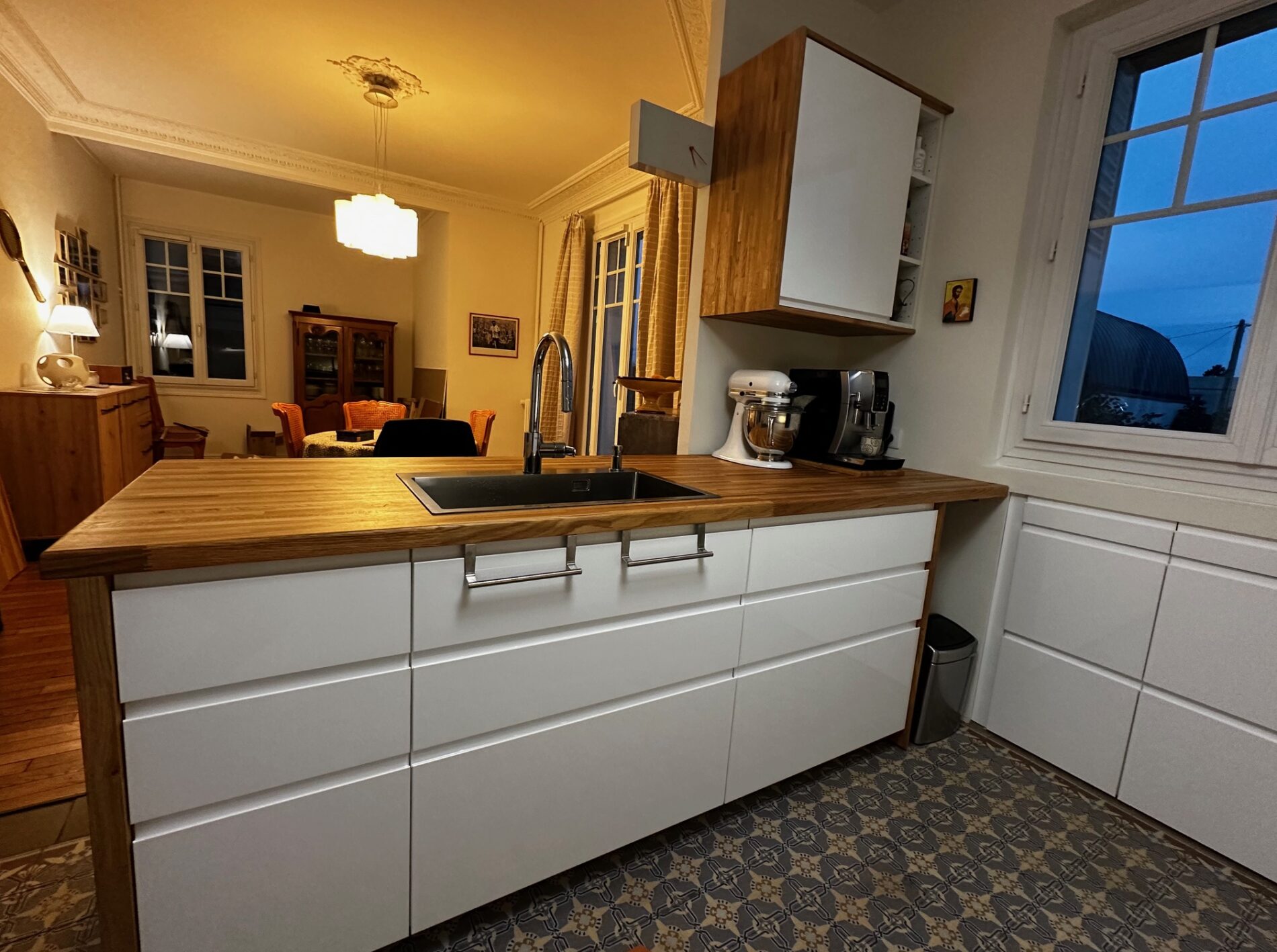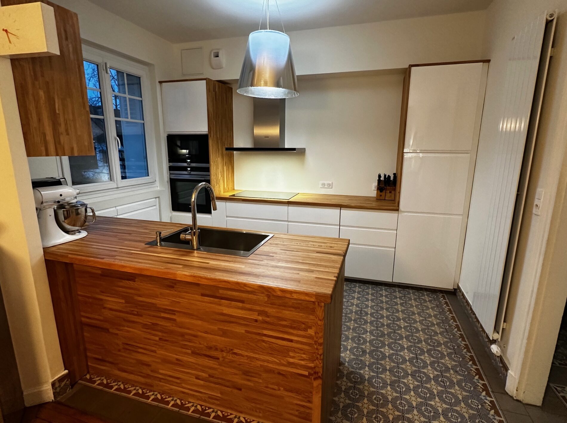 Les plans de travail en Chêne lamellé-collé, apporte une profondeur et une chaleur qui contrastent avec la pureté du blanc.