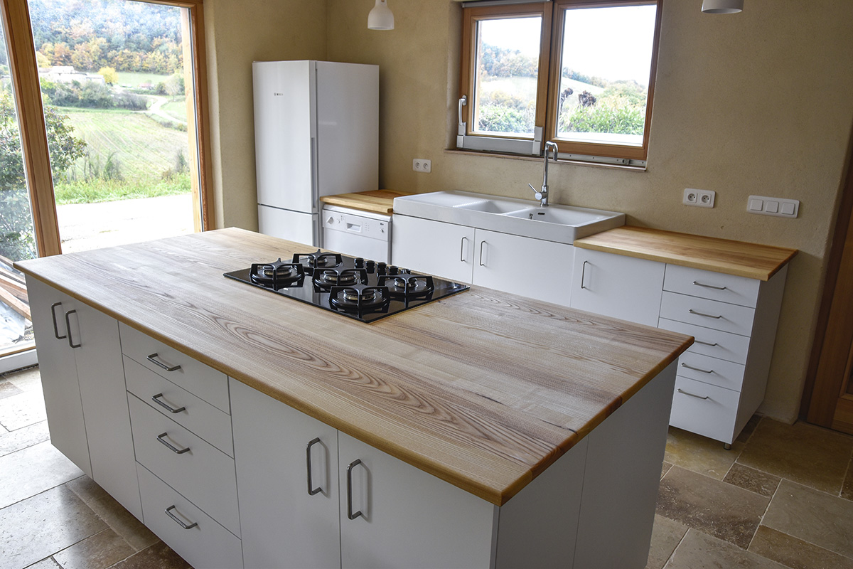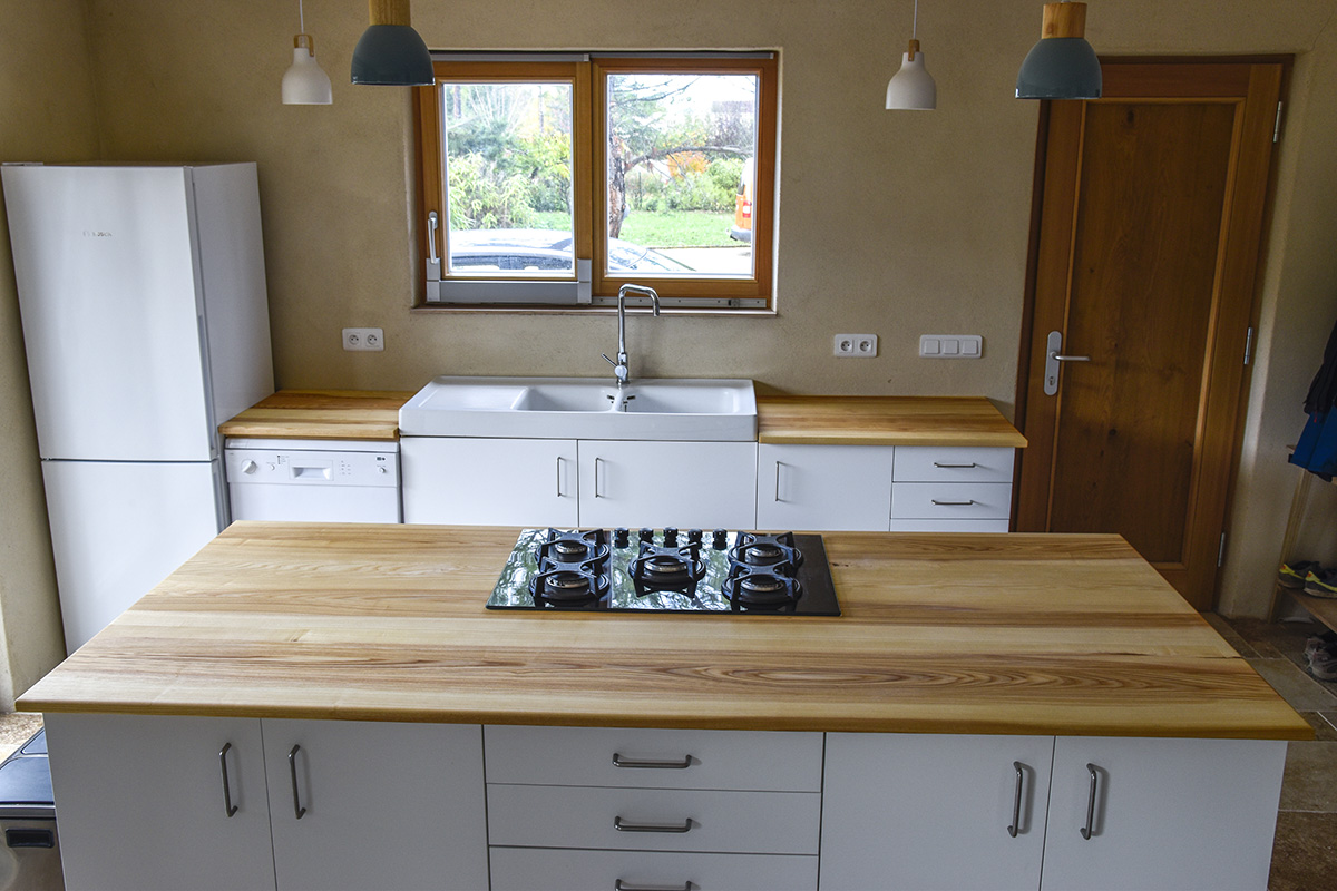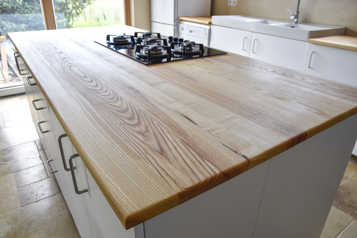 Ici, la cliente nous avez commandé pour sa cuisine, 3 plans de travail en frêne lames massives, le plus grand pour son ilot centrale de 226x102x2.8 avec un usinage quart de rond 8mm sur 2 arêtes, et deux autres plans de travail 64x60x2.8 et 88x64x2.8 à côté de son évier avec l’usinage quart de rond 8mm sur 2 arêtes aussi.
