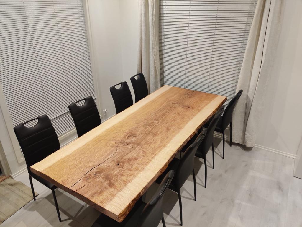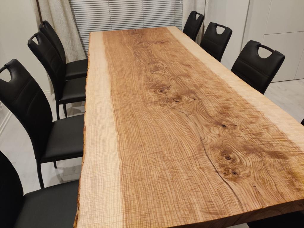 Voici plateaux sortie de l’atelier pour une table de salle à manger : Un plateau en Frêne Oliver Massif, sans assemblage, d’environ 250x85x7.5 cm.
