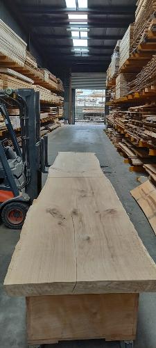 – 1 plateau en chêne massif utilisé comme tables BAR coupé à 2,20 m de long chacun, pour un total de 4,40m en tout, accolés et mis dans la continuité des veines du bois. Largeur entre 80 à 90 cm. Epaisseur de 8 cm.